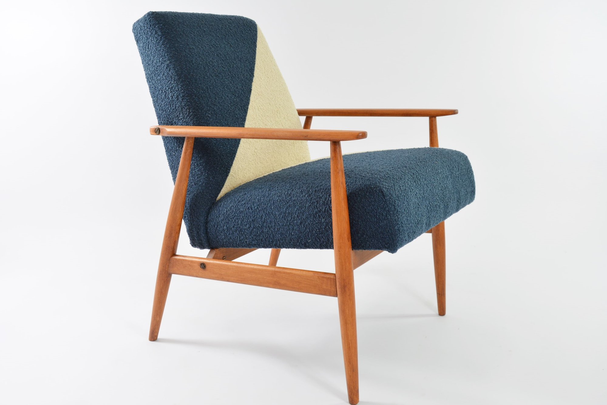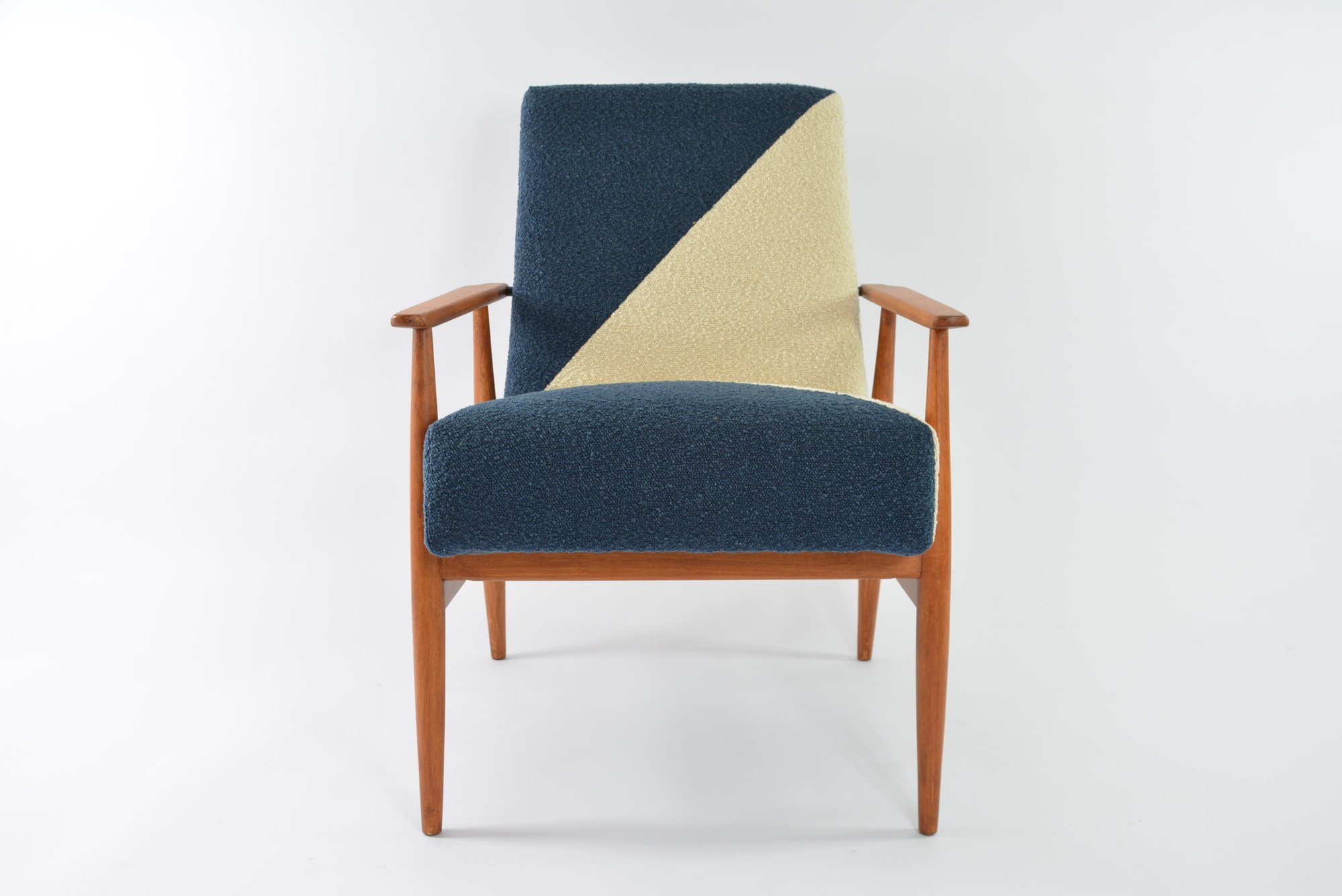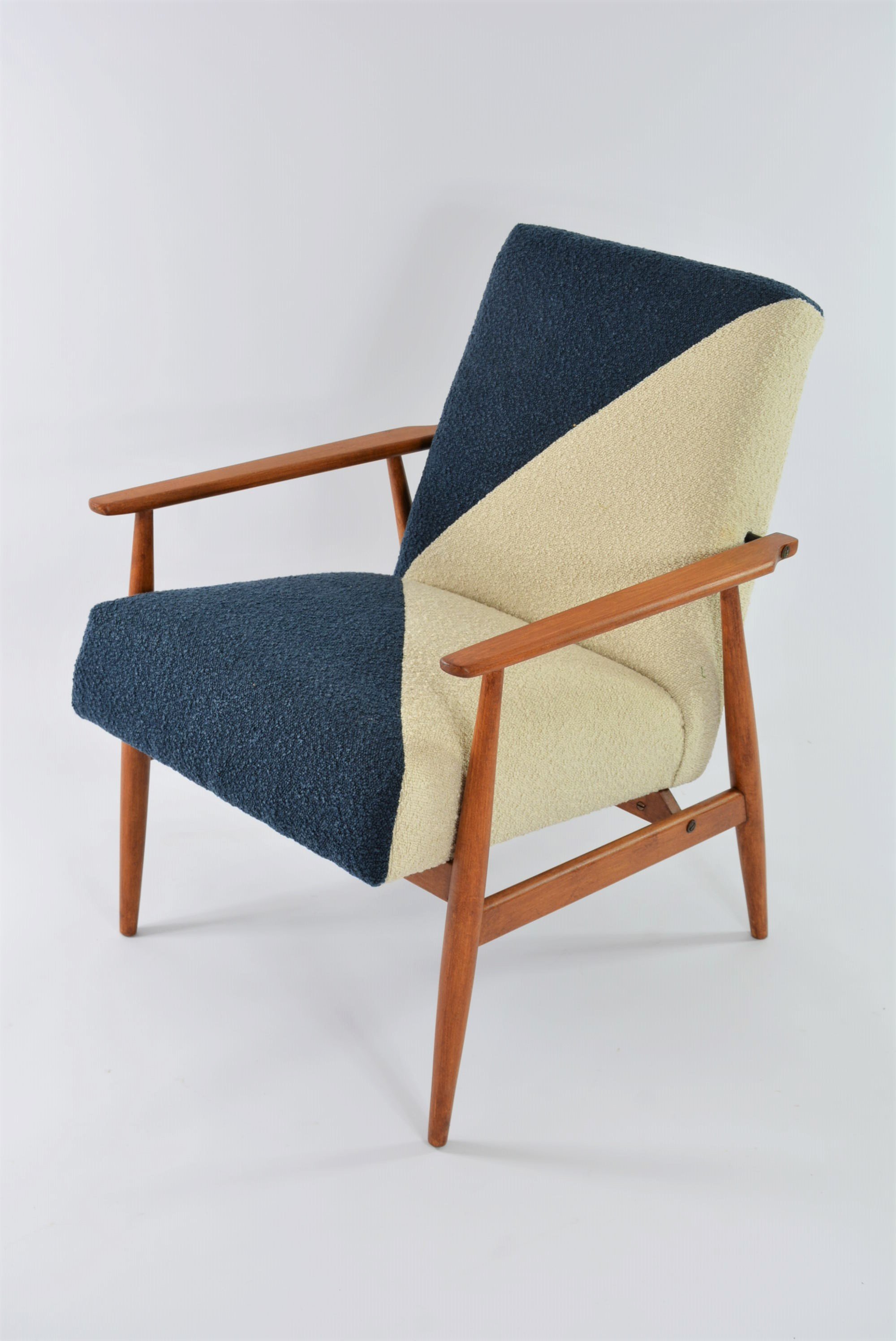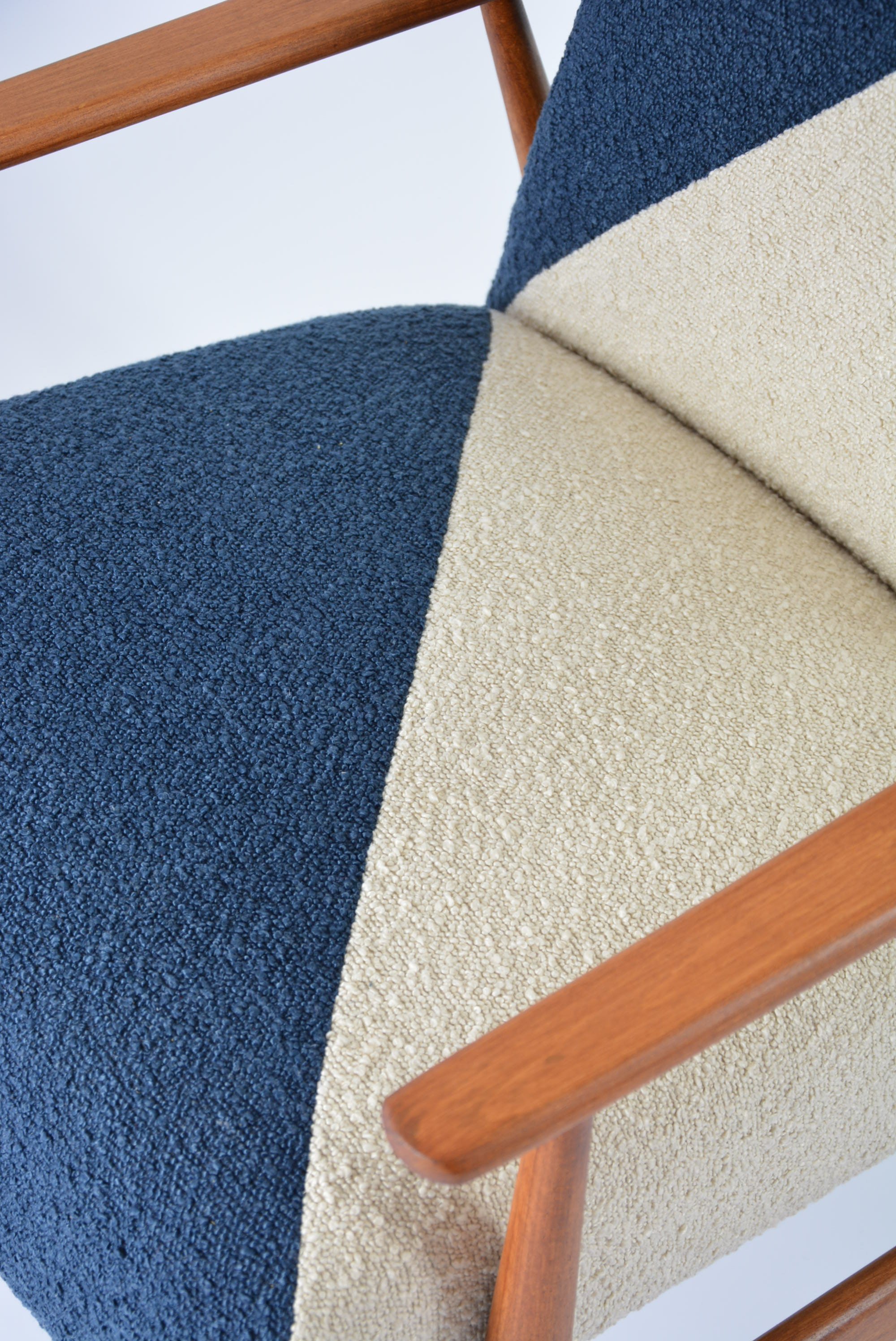 Entièrement restauré. Tissu bouclette synthétique crème et bleu, antitache. Beau vernis teck/ aspect ciré satin/ avec la structure de bois poncée et revernie.