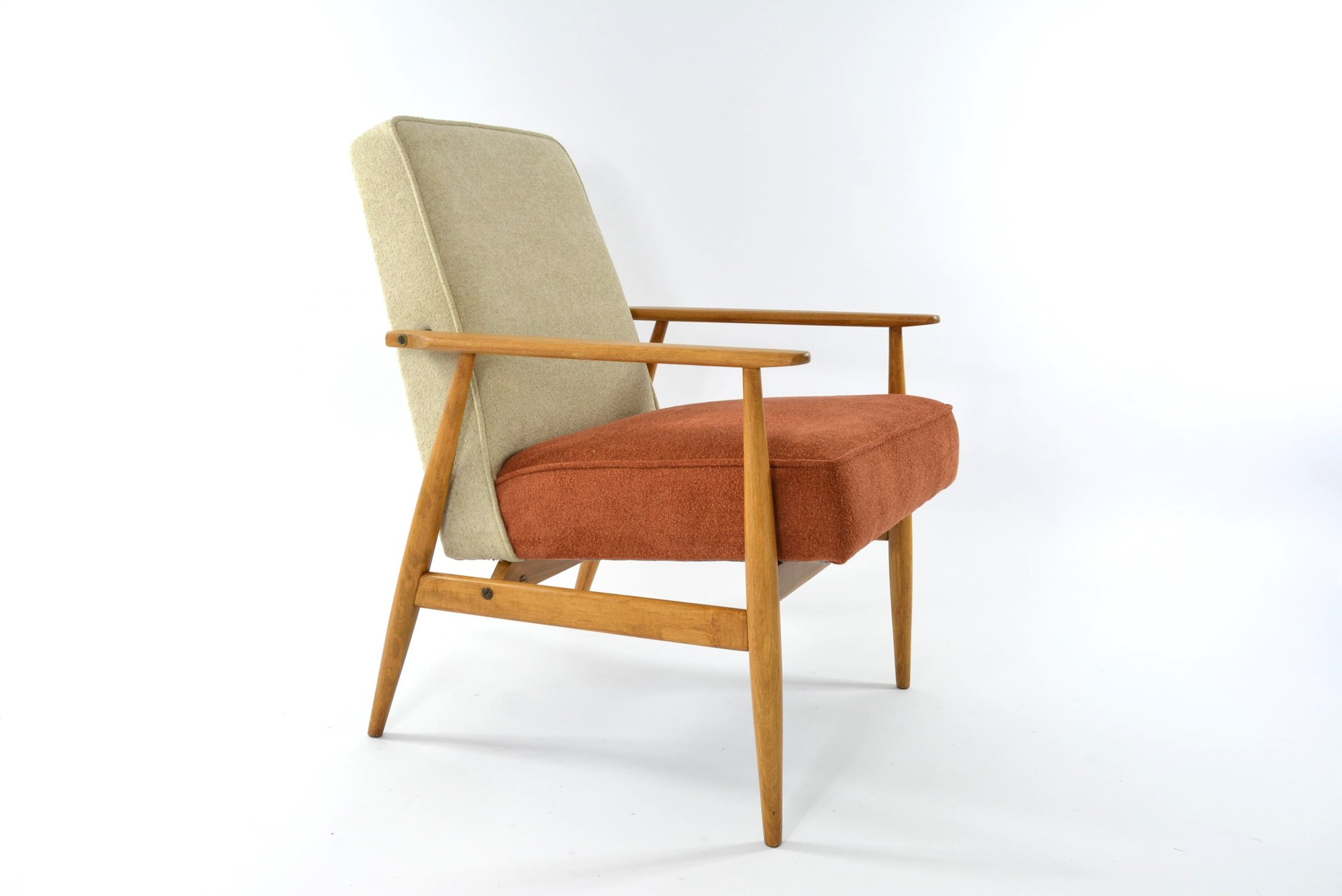 Entièrement restaurés. Tissu type bouclette fine. beige sur le dossier et terracotta sur l'assise. Le passe poil autour de l'assise. Beau vernis teck brun/ aspect ciré satin/ avec la structure de bois poncée et revernie.