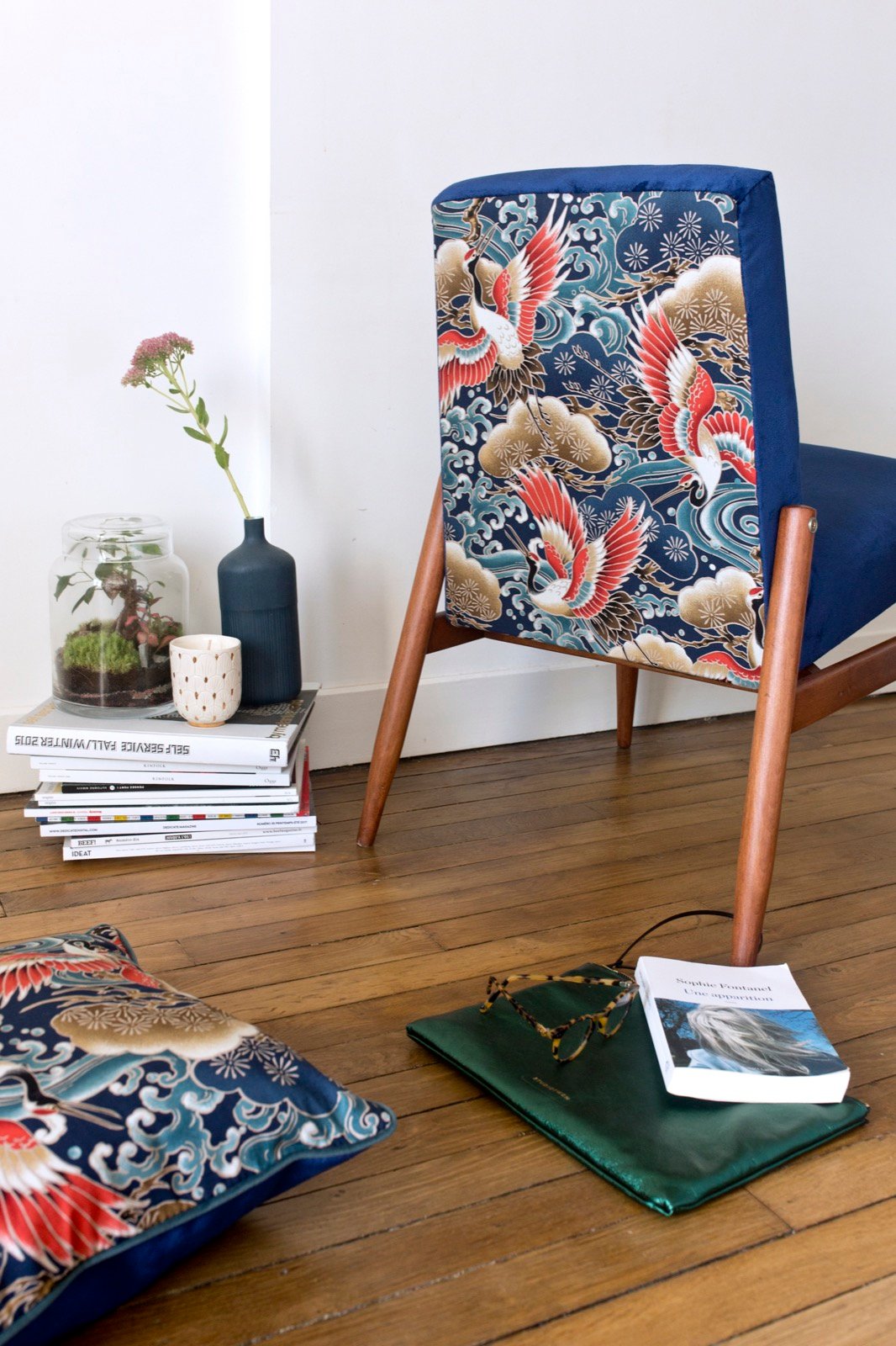 Petit fauteuil des années 60 sans accoudoirs. Construction épurée et fonctionnelle. Modèle idéal pour un petit espace. Entièrement restauré en tissu velours bleu nuit avec le derrière du dossier recouvert d'un tissu exclusif à motifs (Jardin japonais).