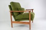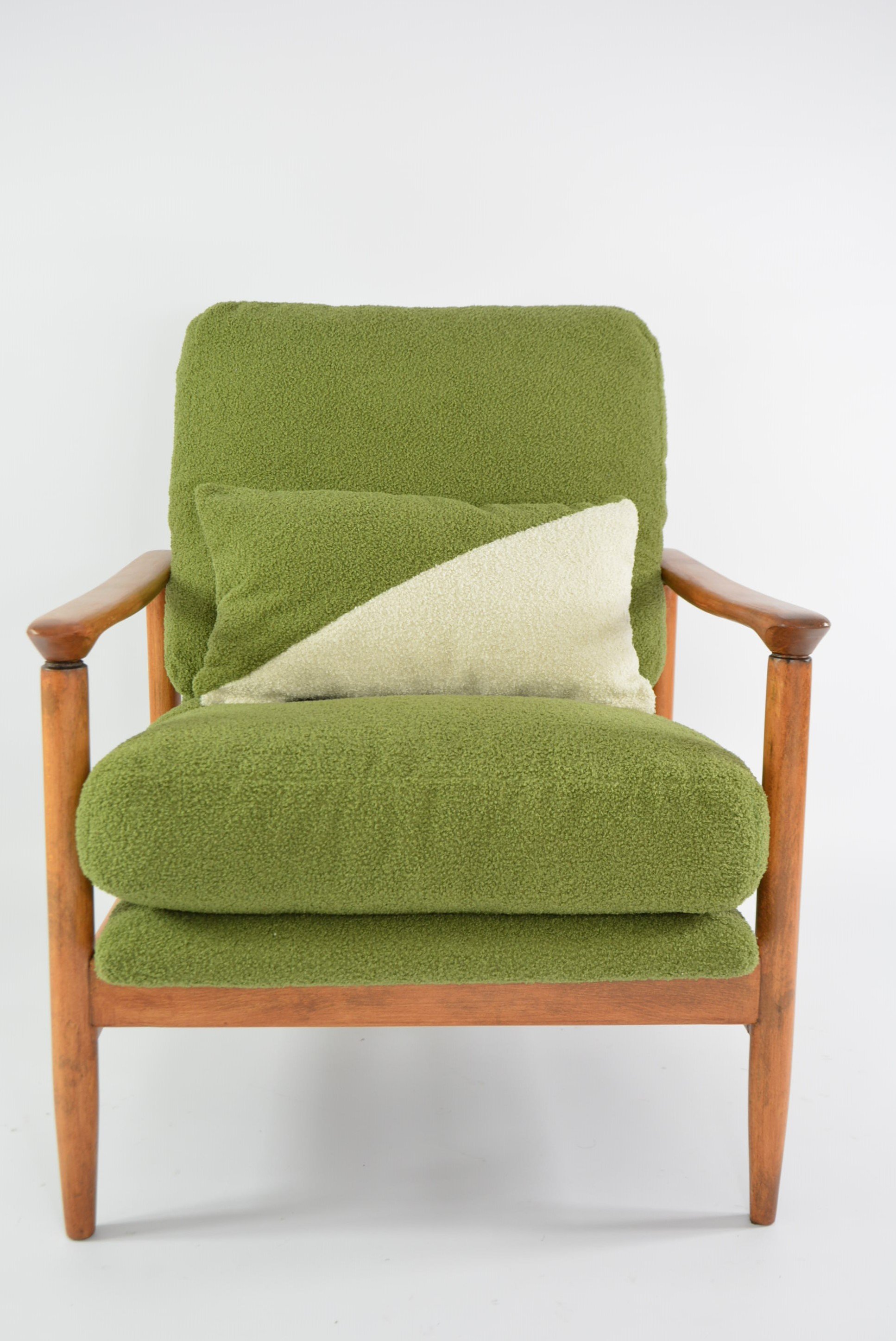 Restaurés en tissu bouclette verte antitache, 100% recyclé, avec la structure entièrement poncée et revernie en couleur teck.