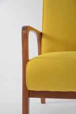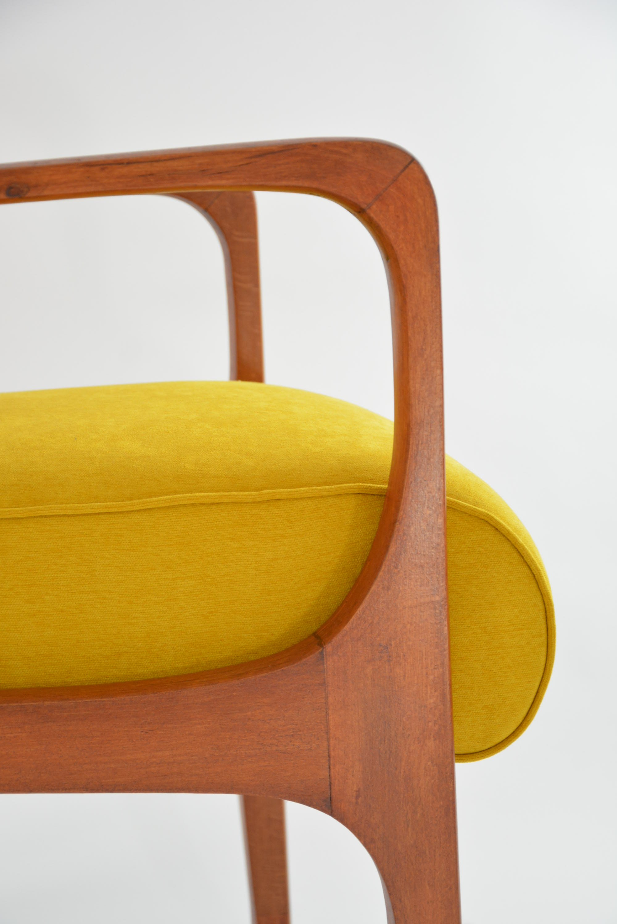 Restauration intégrale des partis bois et de l'assise recouverte d'un magnifique tissu velours antitache jaune, antitache. Bois poncé et revernis: teck brun.