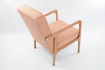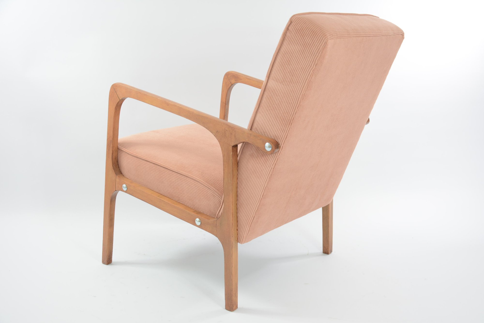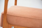 Restauration intégrale des partis bois et de l'assise recouverte d'un magnifique tissu antitache velours côtelé rose-pèche avec le passe poil autour de l'assise.