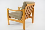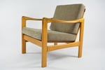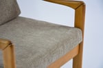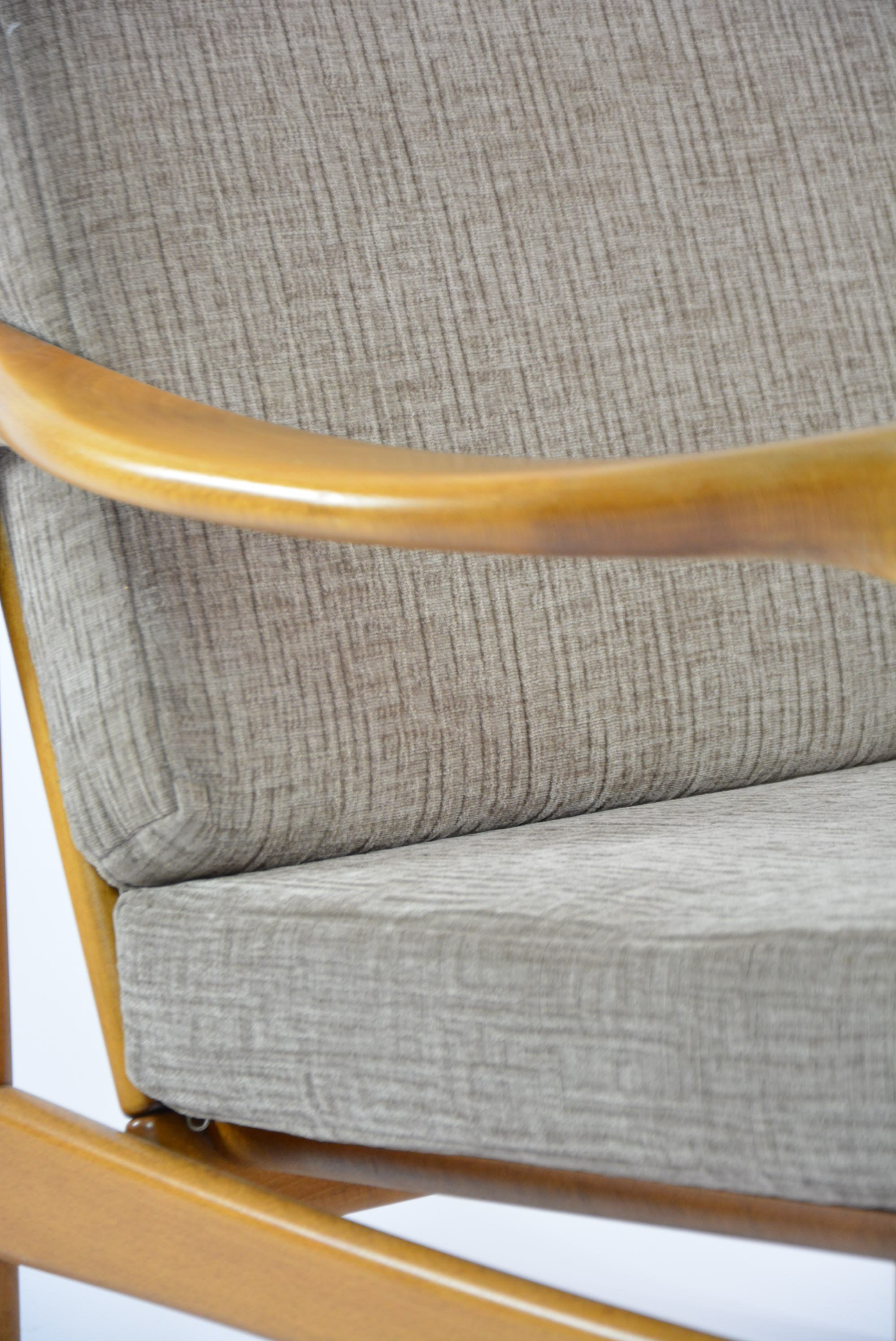 Entièrement restauré: changement intégral des coussins, des ceintures et du bois - couleur chêne clair (nouvelle patine) . Tissu antitache couleur cappuccino avec un relief.
