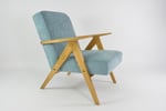 Piétement en compas, l'assise mousses semi-fermes. Tapissé en tissu bouclette fine bleu ciel antitache et extrêmement résistant.