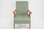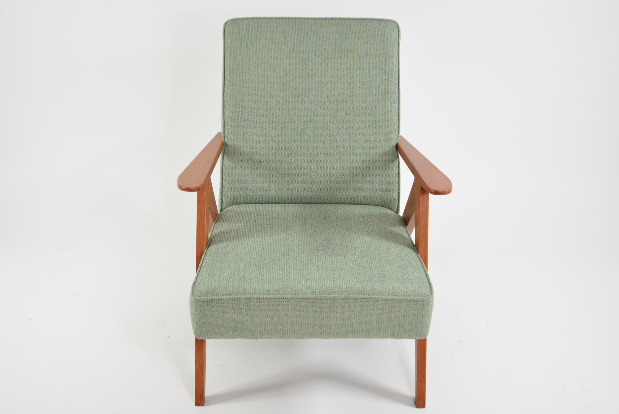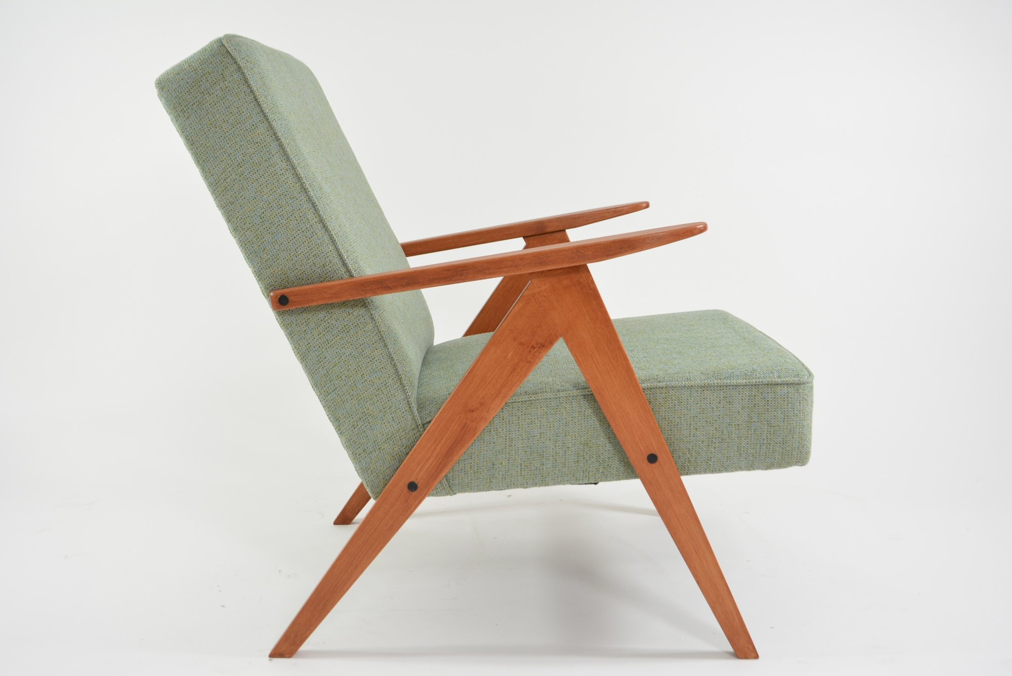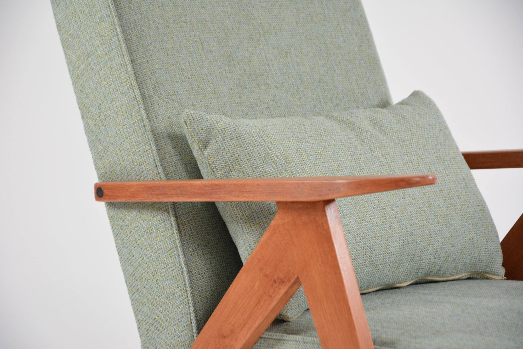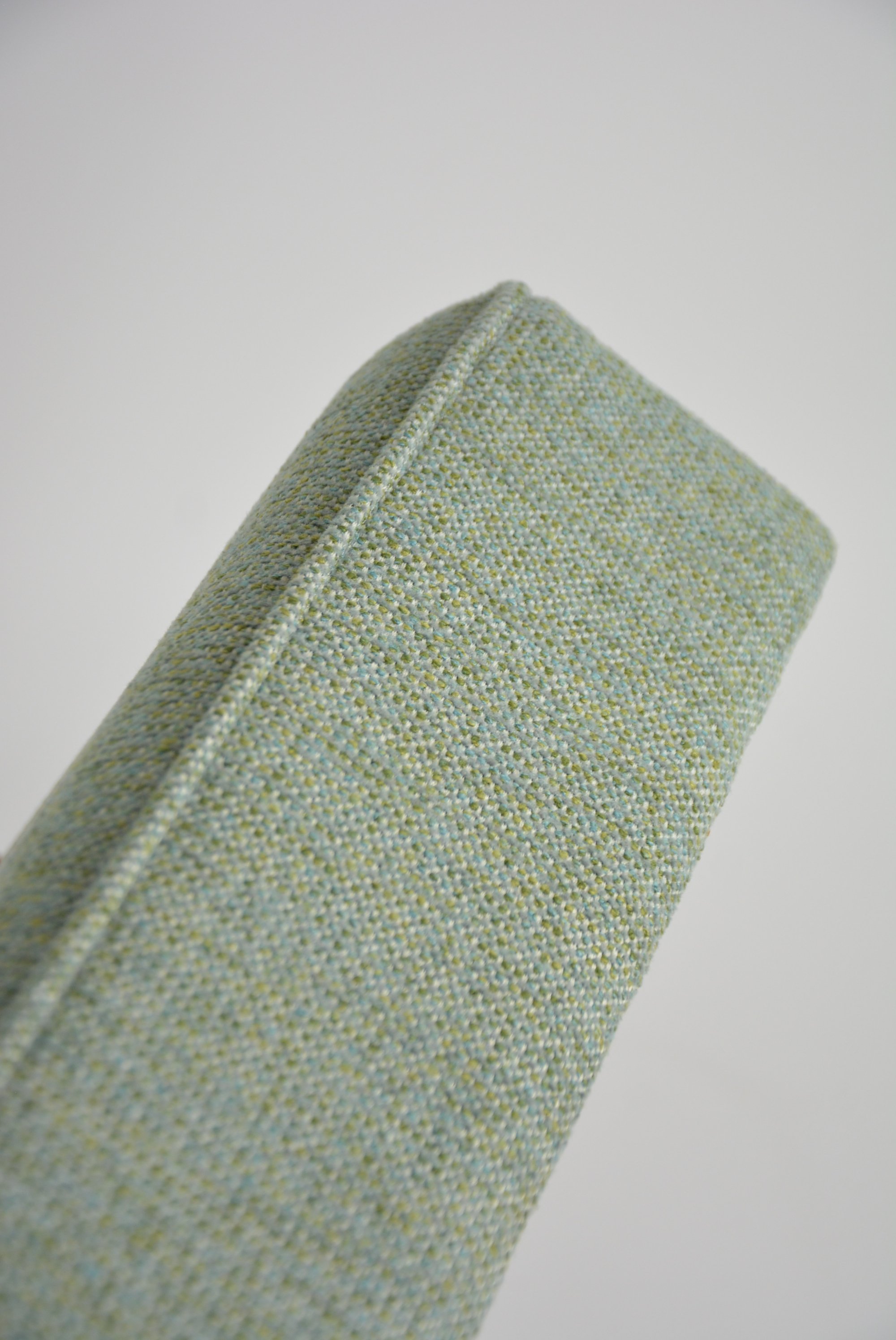 Piétement en compas, l'assise mousses semi-fermes. Tapissé en tissu chiné vert d'eau clair, antitache et extrêmement résistant.