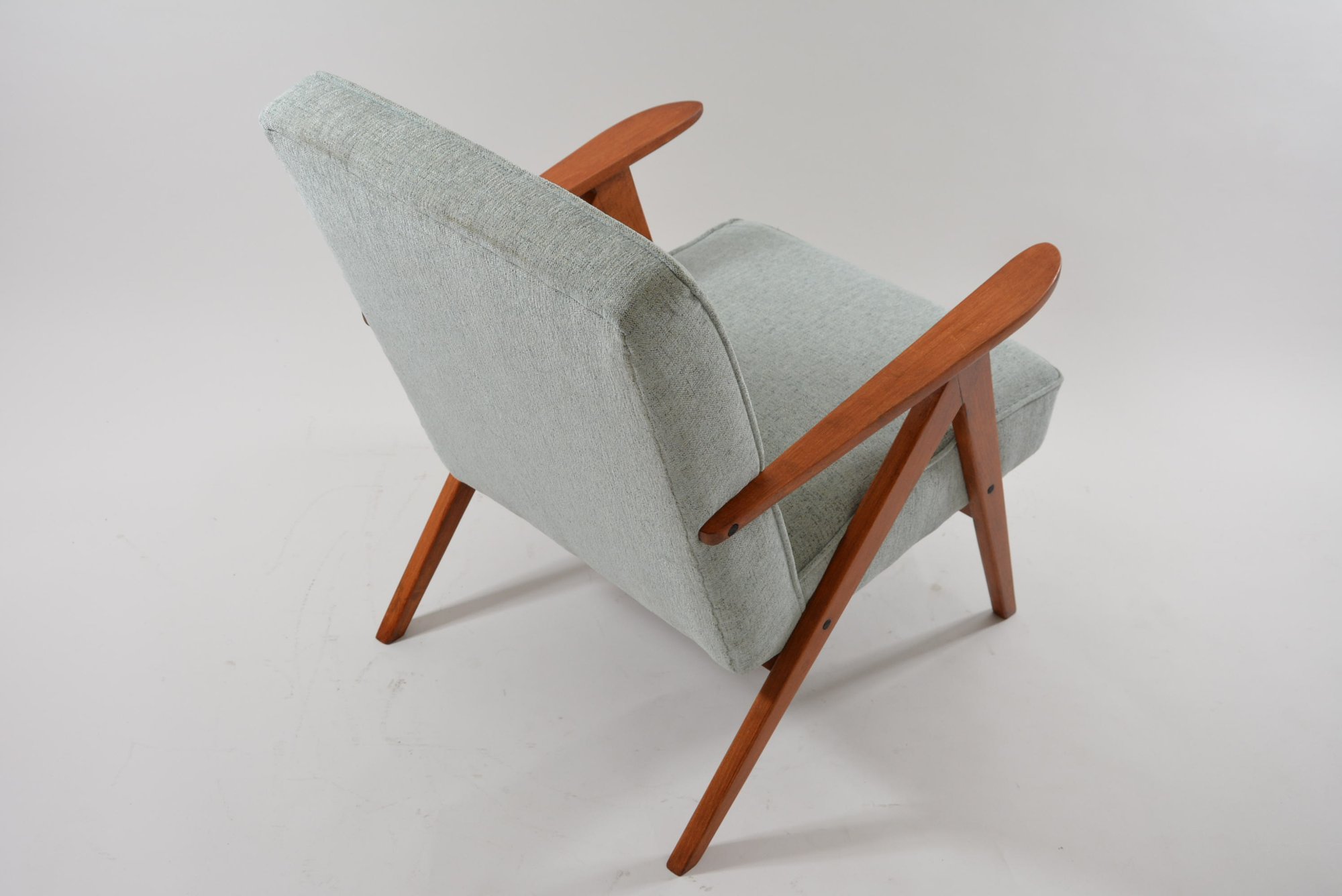 Rénovation intégrale comme pour toutes nos pièces: garniture, bois, tissu - chiné mint (vert très clair) ANTITACHE. Bois de couleur teck foncé.