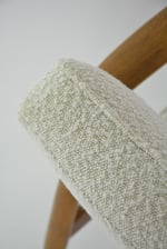 Réfection totale de la structure bois (ponçage, vernis neuf) et de l'assise (garniture, sangles neufs). Tissu bouclette synthétique blanche lavable.