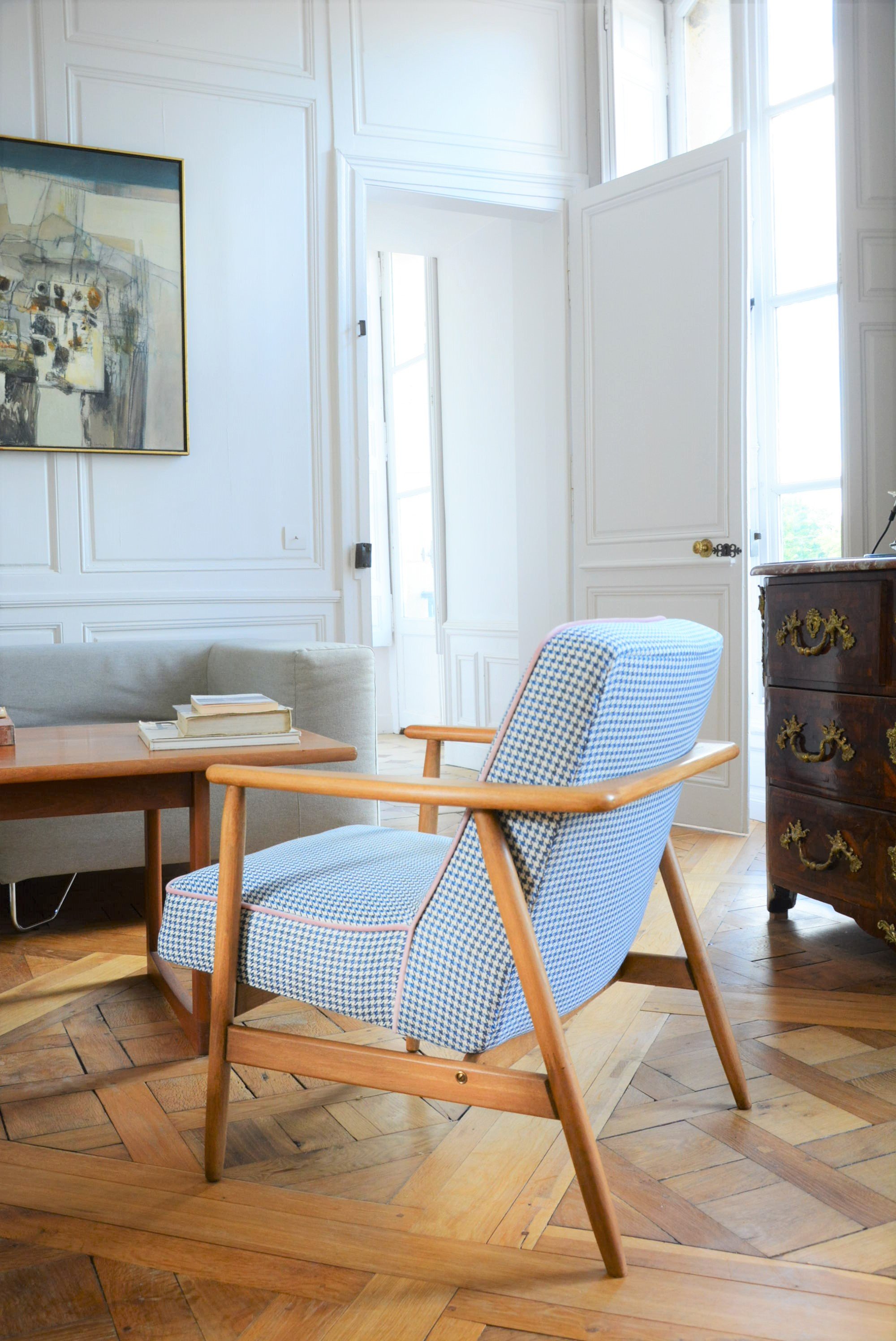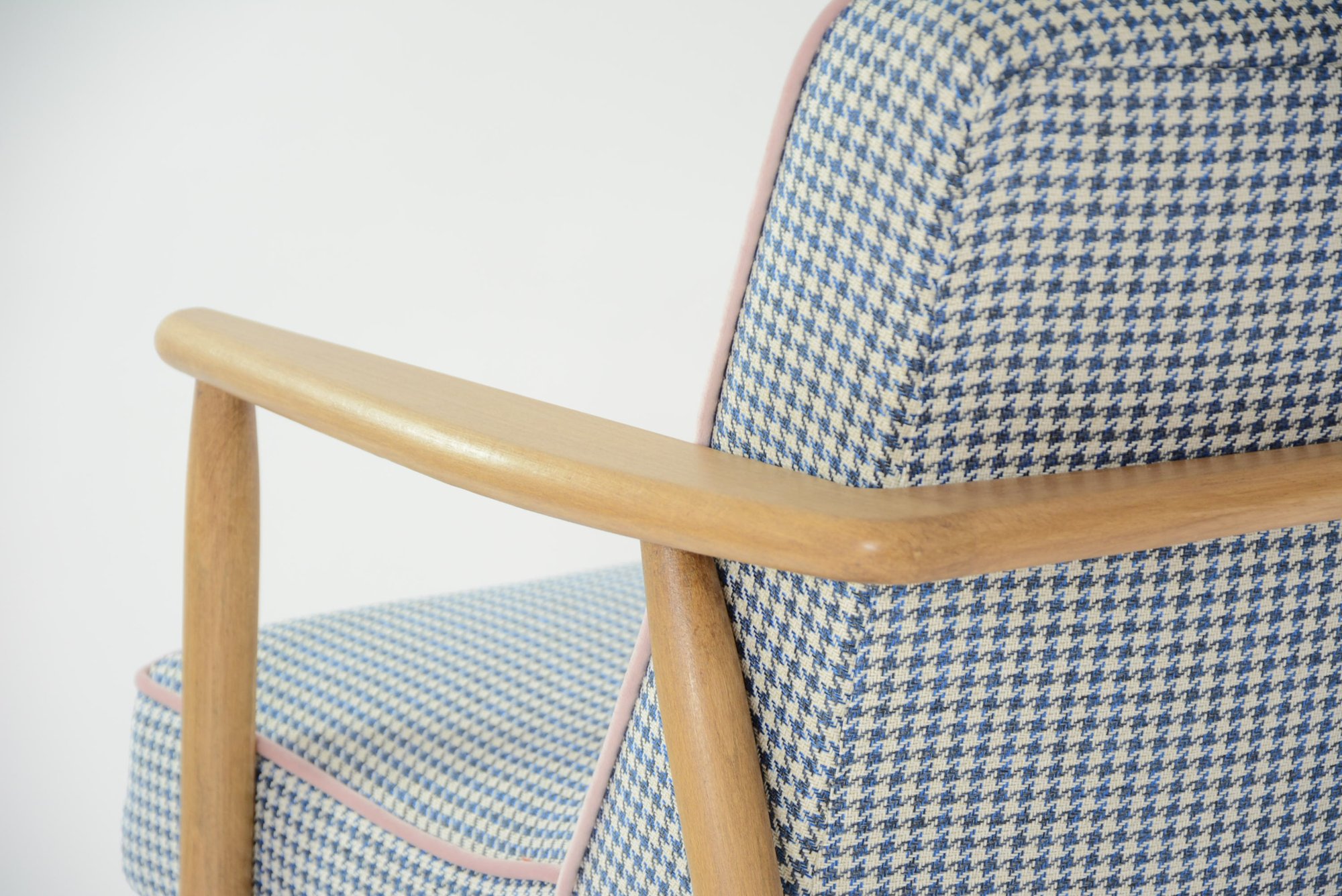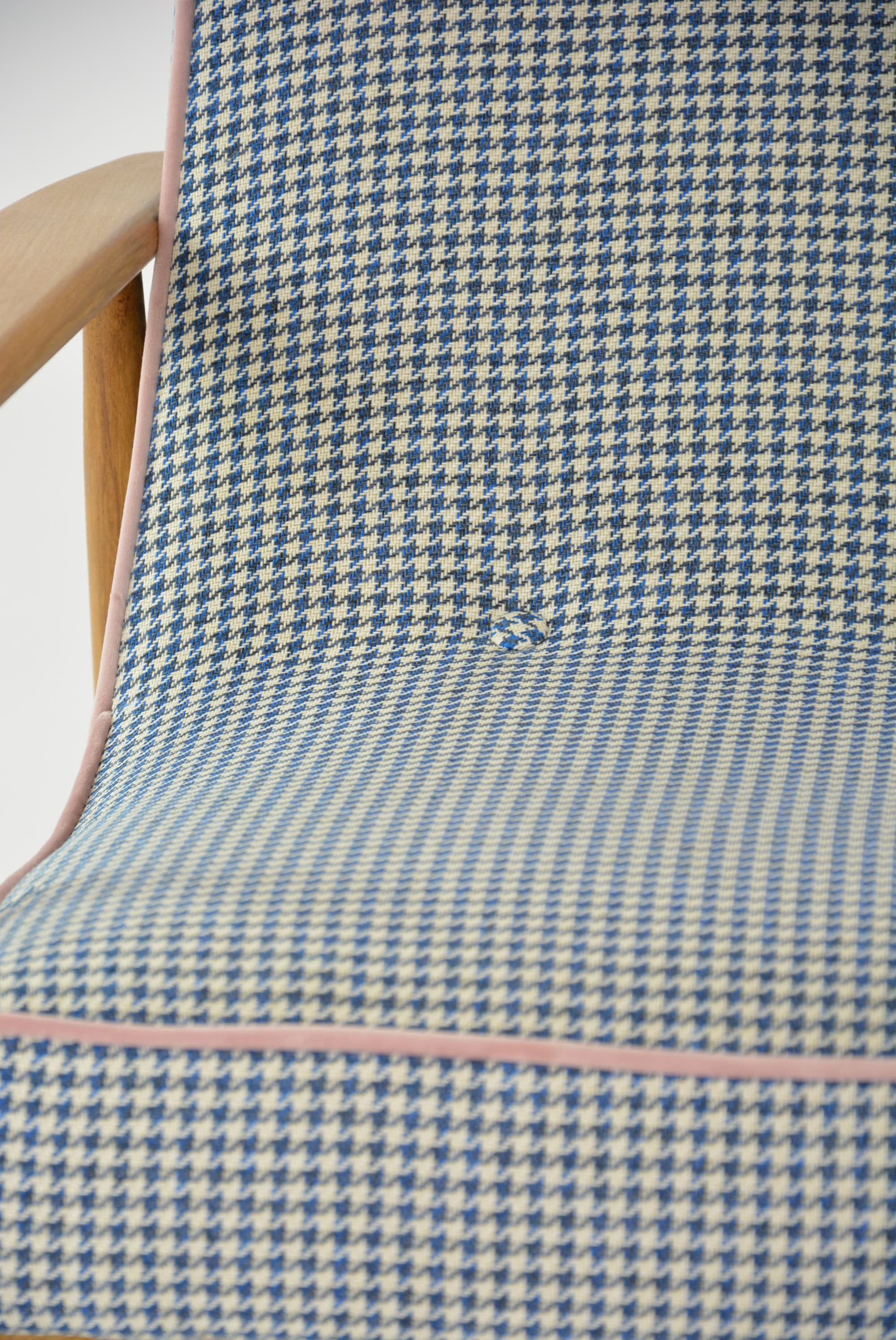 Réfection totale de la structure bois (ponçage, vernis neuf) et de l'assise (garniture, sangles neufs). Tissu chiné pieds de poule bleu avec le passe poil rose poudré.