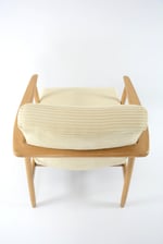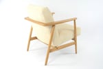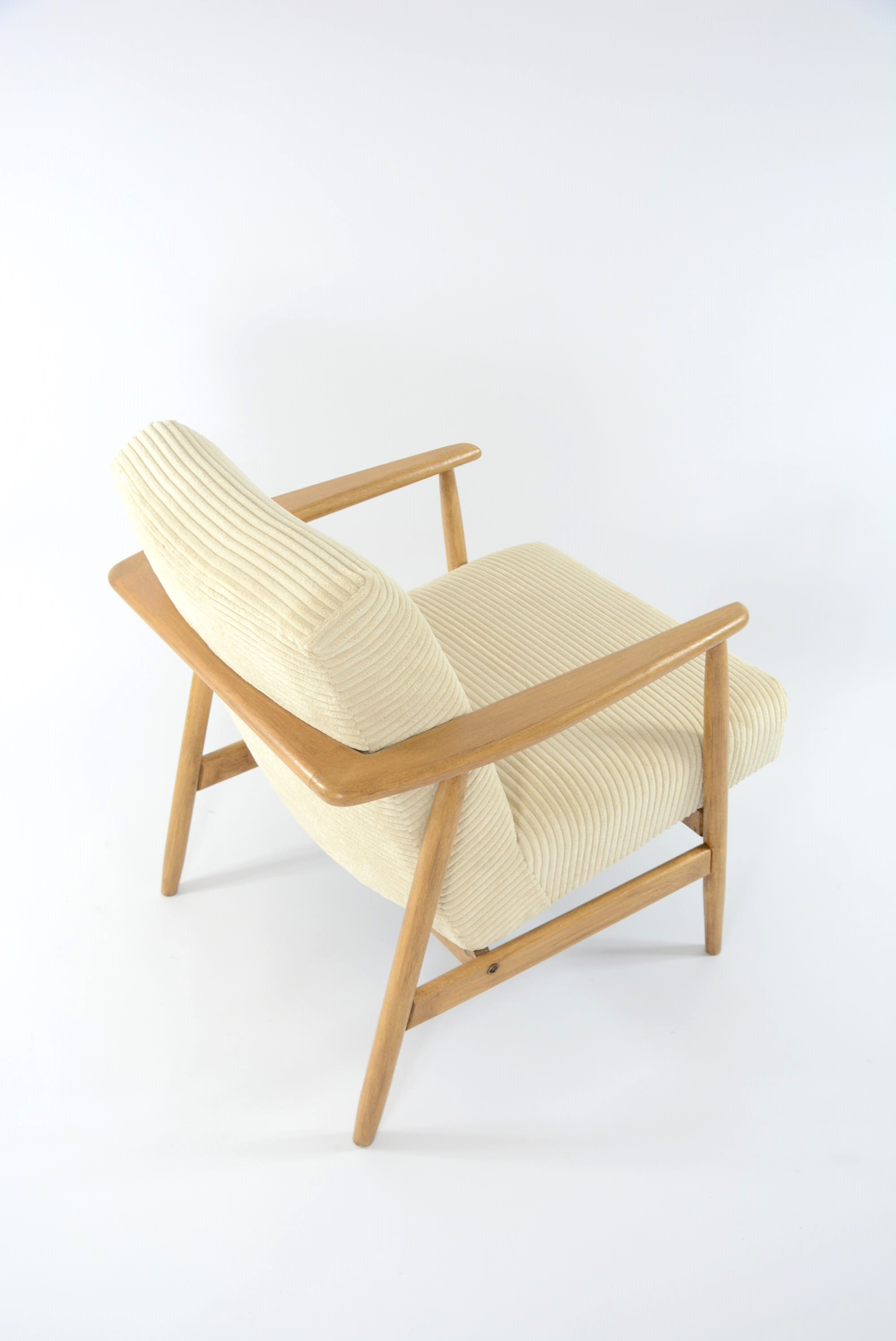 Réfection totale de la structure bois (ponçage, vernis neuf) et de l'assise (garniture, sangles neufs). Tissu velours côtelé ivoire, antitache.