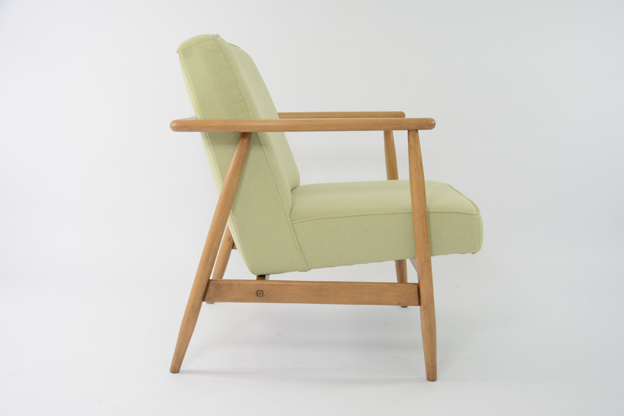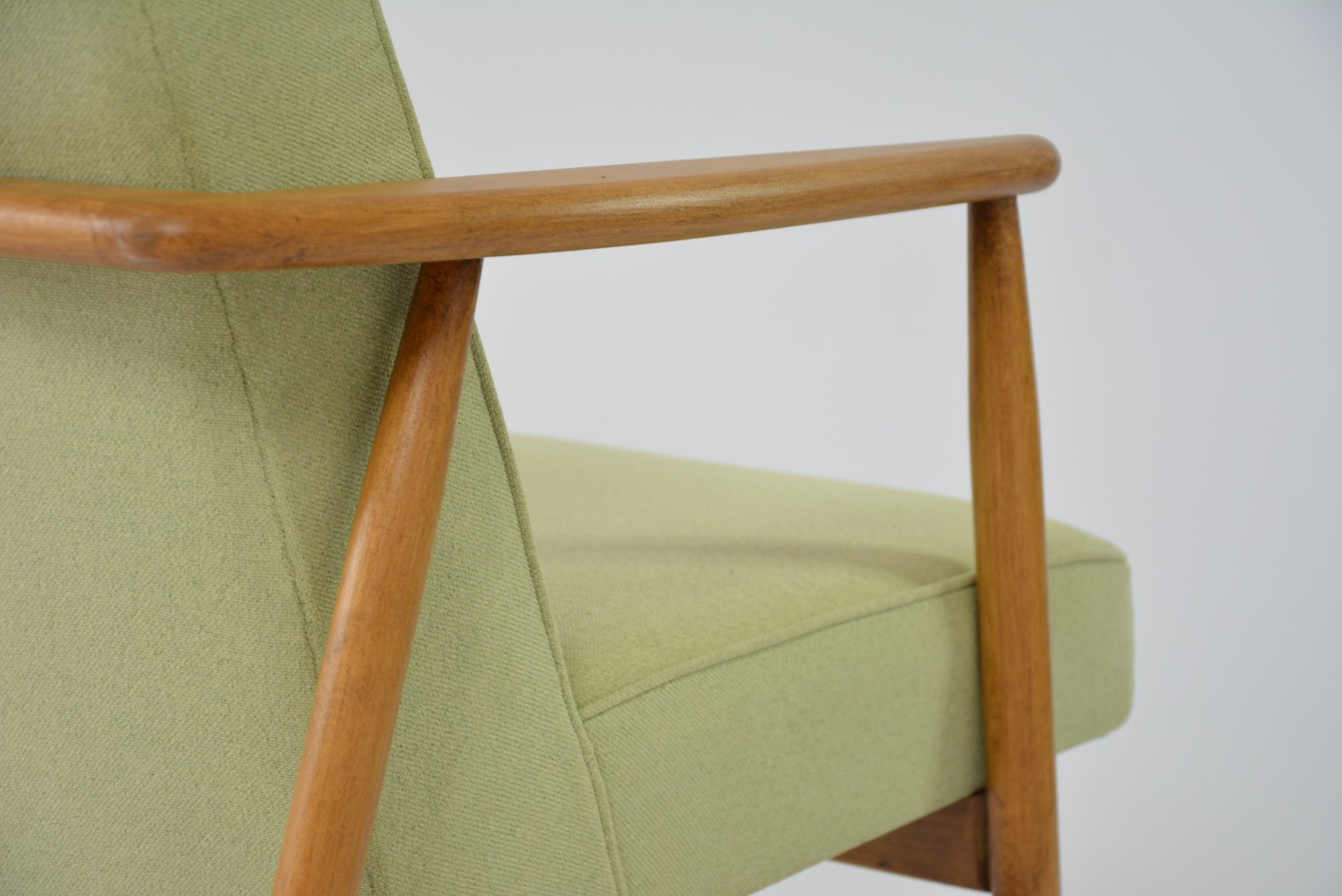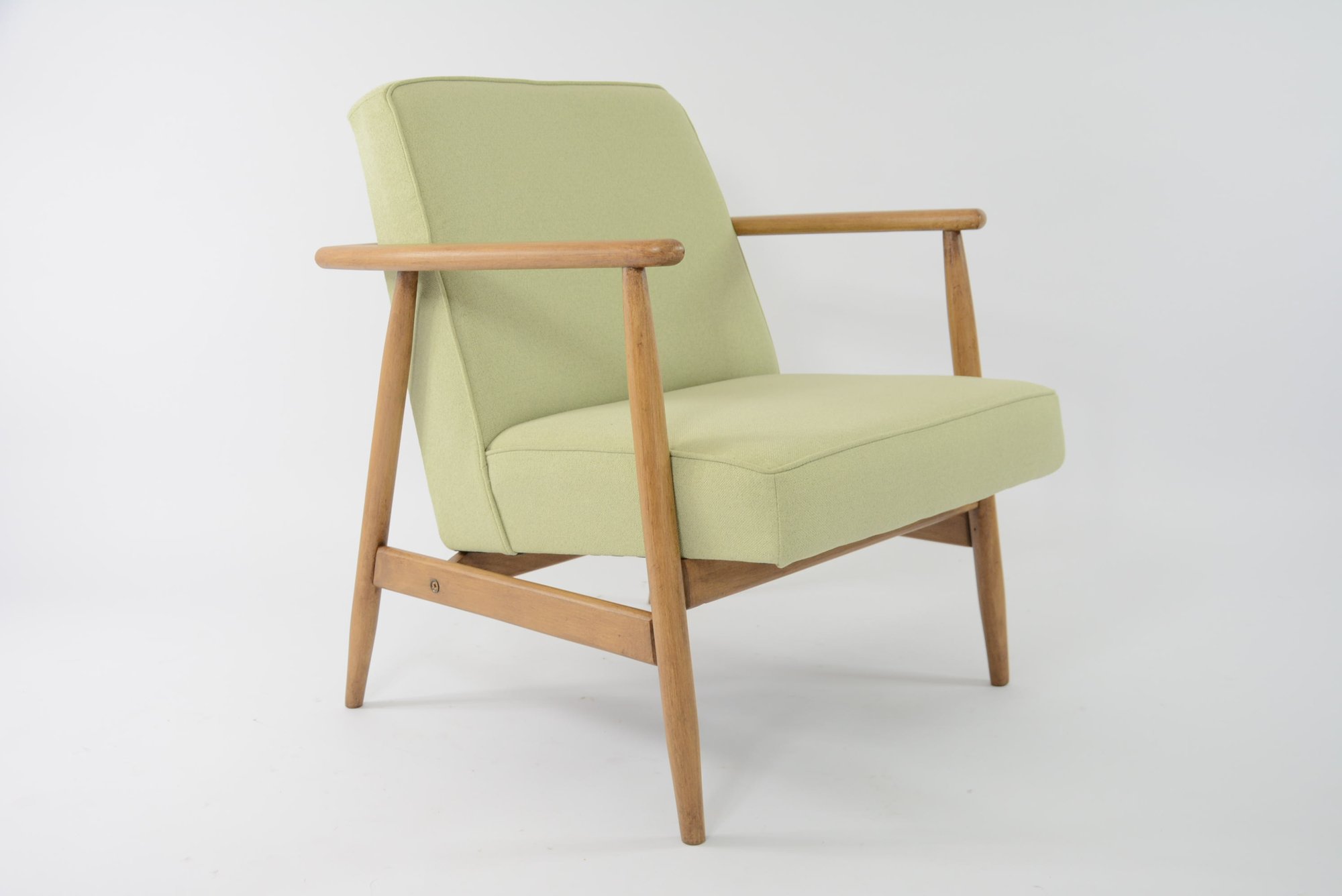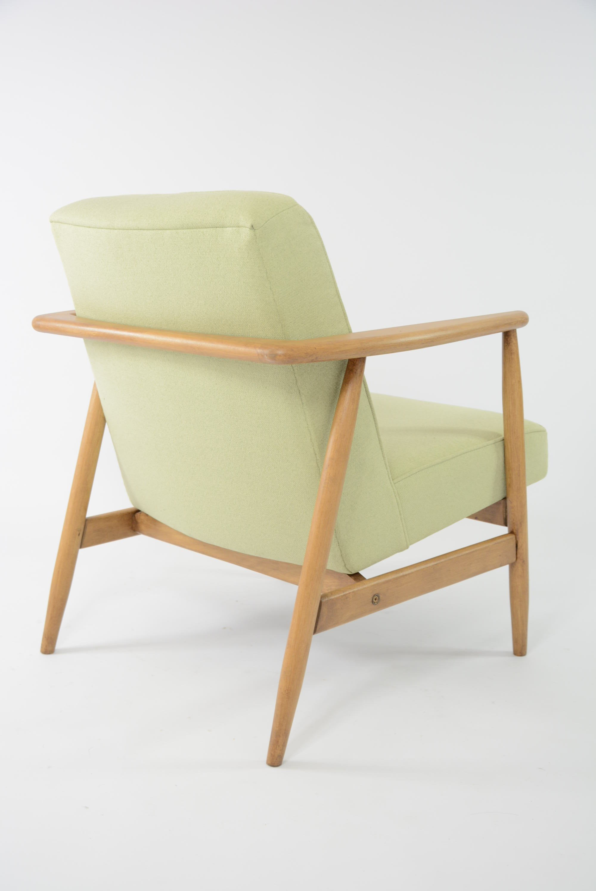 Réfection totale de la structure bois (ponçage, vernis chêne neuf) et de l'assise (garniture, sangles neufs). Tissu chiné vert mint clair avec le passe poil autour de l'assise - antitache.