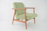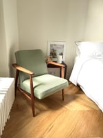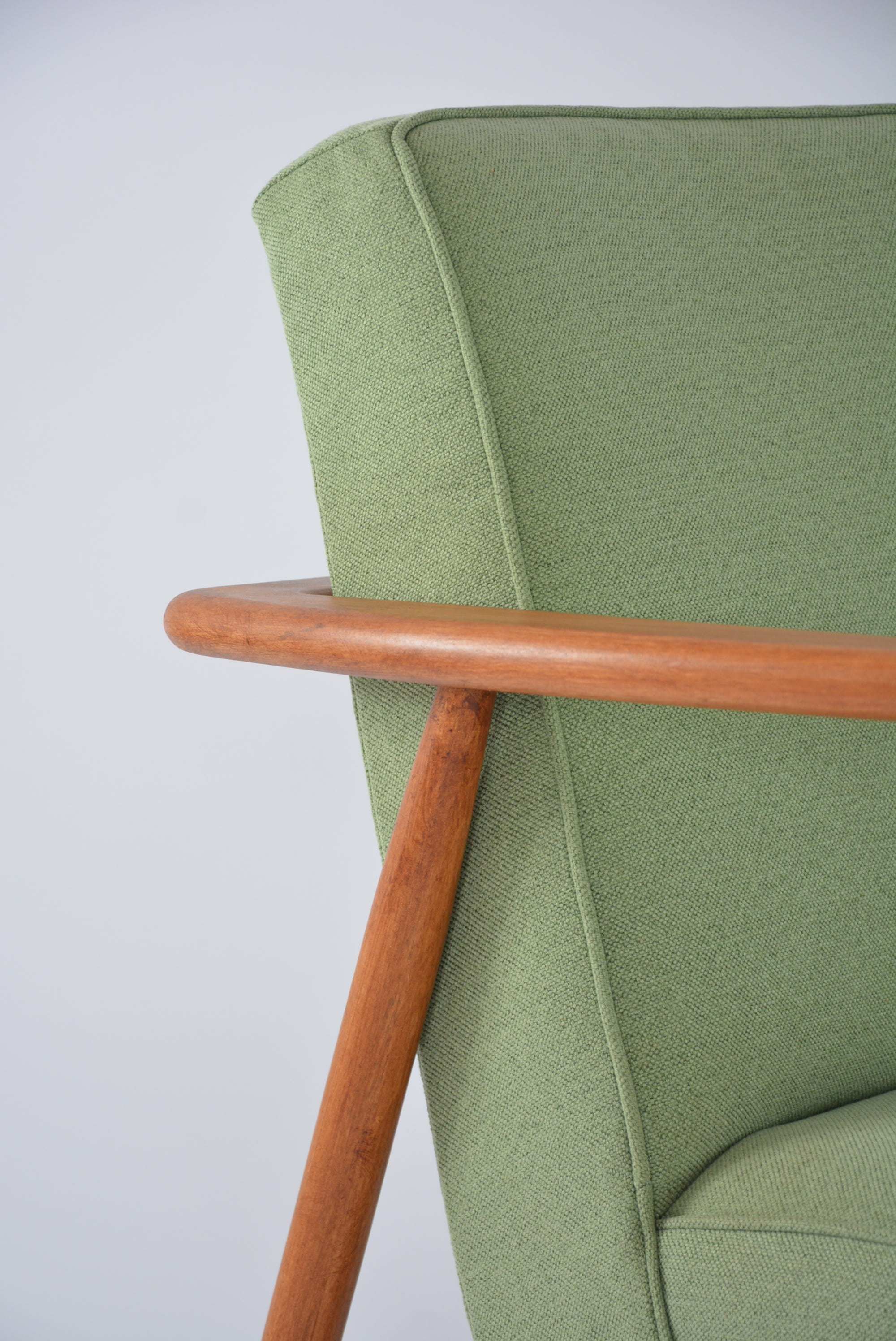 Réfection totale de la structure bois (ponçage, vernis teck neuf) et de l'assise (garniture, sangles neufs). Tissu chiné vert pistache pastel avec le passe poil autour de l'assise - antitache.