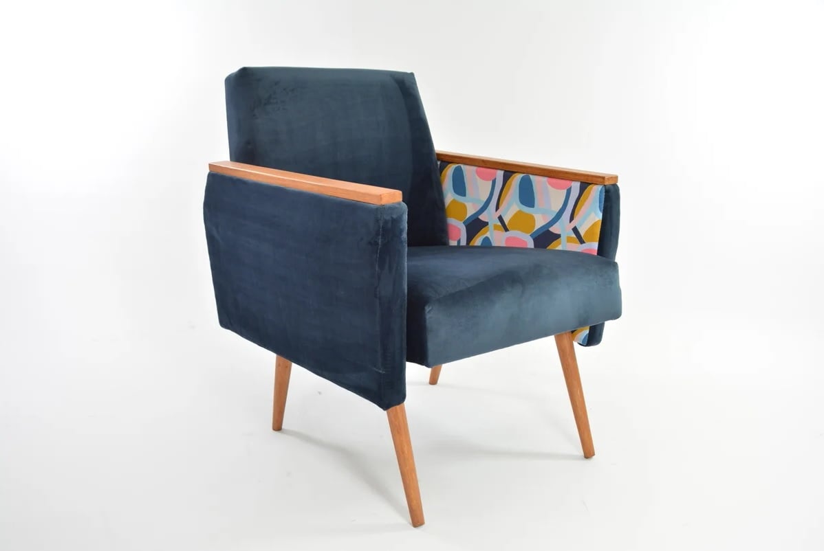 Construction robuste à l’accueil agréable avec le rembourrage en mousses légères. Entièrement restauré et recouvert d'un tissu velours bleu nuit, l'intérieur des bords recouverts d'un tissu MATISSE.